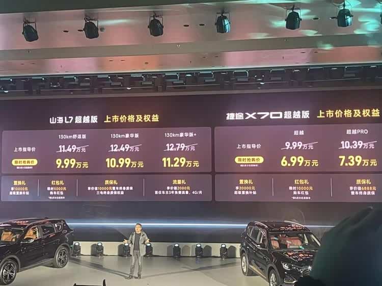 售价方面,捷途X70超越版推出2款车型,官方上市指导价格区间为9.99-10.39万元,限时抢购价格区间6.99-7.39万元;山海L7超越版共推出3款车型,官方上市指导价格区间为11.49-12.79万元,限时抢购价格区间9.99-11.29万元。限时抢购价指的是在包含1-2万元的置换补贴的基础上,在5月31日之前购车可以享受1万元的购车红包。