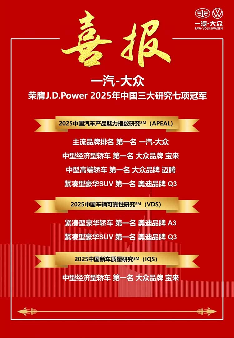 喜报丨一汽-大众荣膺J.D.Power 2025年中国三大研究七项冠军