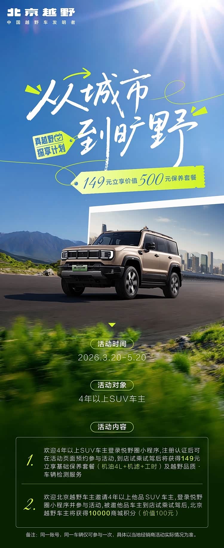 北京越野“从城市到旷野——真越野探享计划”面向4年以上SUV车主,车主可登录悦野圈小程序,点击“我的”,进入活动页面预约参与活动,到店试乘试驾后,即可体验“149元立享基础保养套餐(机油4L+机滤+工时)及越野品质·车辆检测服务”。同时,北京越野车主邀请4年以上他品SUV车主,登录悦野圈小程序并参与活动,被邀他品车主到店试乘试驾后,北京越野车主将获得10000商城积分(价值100元)。