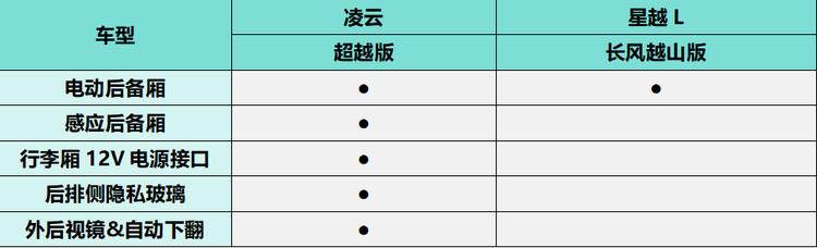 虽然凌云超越版和星越L长风越山版都配备了电动后备厢,但凌云超越版拥有感应后备厢功能,在春季出游前的超市采购,双手拎着出游的补给不便开门,通过钥匙感应就能打开后备厢。春游计划持续到傍晚,或者干脆来一次过夜露营,还有可以充当“移动电站”的行李厢12V电源为照明设备供电。孩子在草地上打滚弄脏了衣服、玩水湿了裤子、或者想在到达露营地前换上舒适的便装,后排隐私玻璃能够隔绝外界不经意扫过的视线。而当春游目的地是没有标准的划线的老旧景区的水泥台、乡间农家乐的碎石地,外后视镜&自动下翻则能够帮助驾驶者更好的看清两侧障碍物,避免剐蹭到低矮的树桩或石墩。