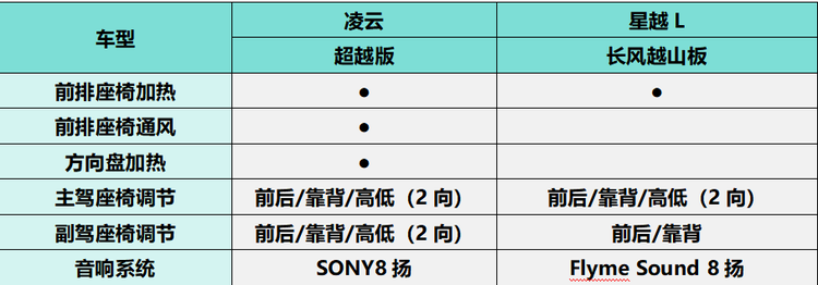 论座椅配置对不同身材乘员的适配性,凌云超越版主/副驾均支持前后/靠背/高低调节,但星越L长风越山版仅主驾座椅将这6向调节配全,副驾只具备前后/靠背调节,若是没有座椅高低调节,身材矮小者可能会因为视野不够开阔看不清窗外的春色,身材高大者又可能会面对头部顶到车顶的压抑。此外,感官优化部分,凌云超越版搭载在全球拥有更高知名度的SONY品牌8扬声器音响系统,星越L长风越山版搭载吉利自研的Flyme Sound 8扬声器音响系统。