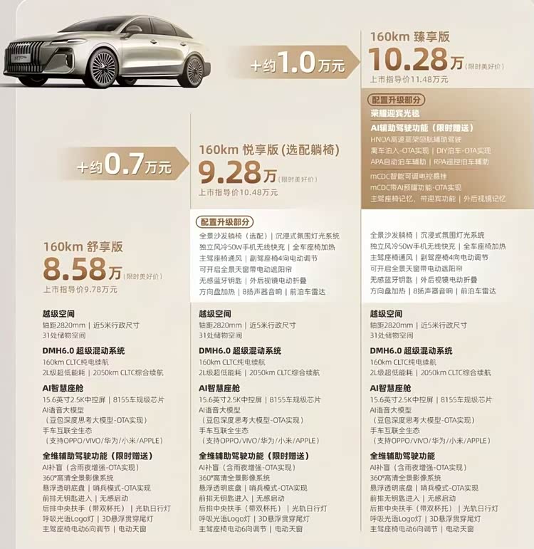 作为一款定价为10 万级市场的混动家轿,荣威 M7 DMH 在舒适性、智能化、续航能力与设计美学上全面实现越级突破,精准契合家庭用户对高价值混动轿车的核心期待。新车限时起售价仅8.58万元起,哪怕是最入门的车型也有 160km 纯电续航、豆包 AI 车机、8155 芯片、360 度全景影像,能满足绝大部分使用场景的需求。