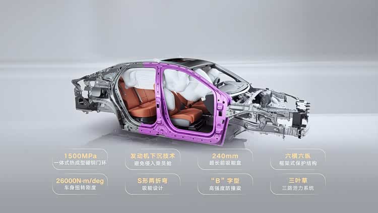 进入乘员舱区域,一体式热成型硼钢门环与六横六纵框架式底部结构共同构成的笼式车身,更是为驾乘者打造了“移动安全堡垒”。其中,一体式热成型硼钢门环的强度达到1500MPa,能在侧面撞击发生时,有效抵御撞击能量;六横六纵的框架式结构则在底部形成稳定支撑,即便遇到多方向撞击,也能保持乘员舱的完整性。而整车身扭转刚度达到26000 Nm/deg,不仅能在高速过弯、颠簸路段时保持车身的稳定性,避免车身变形影响操控,更进一步强化了车身的整体安全性能。