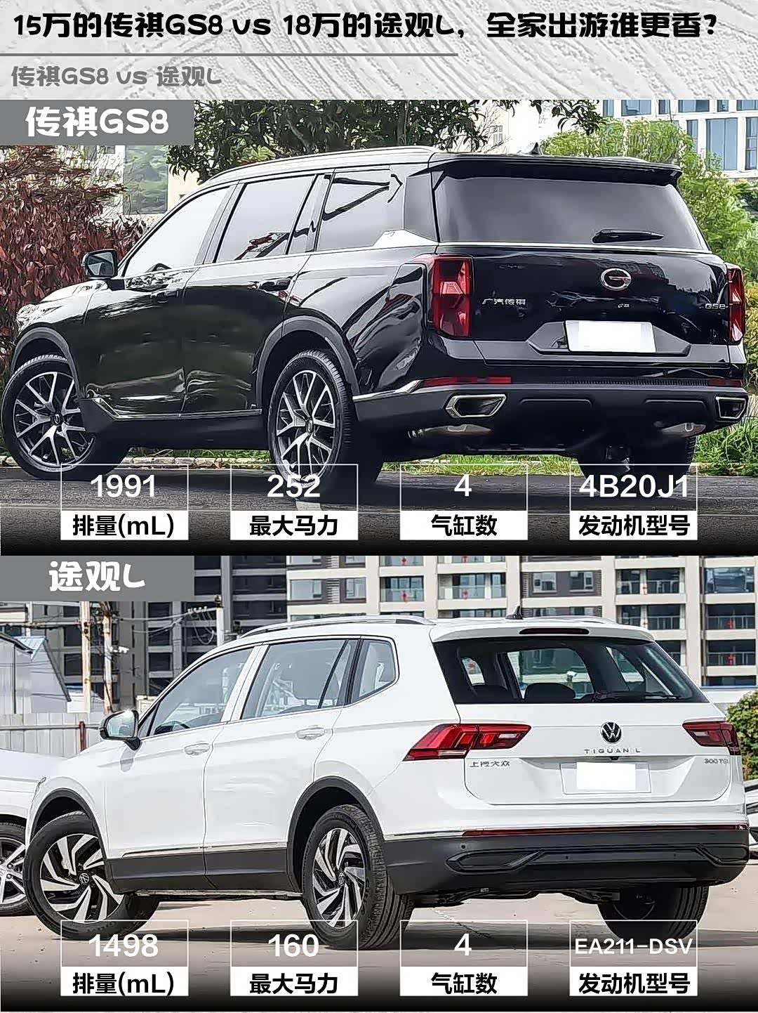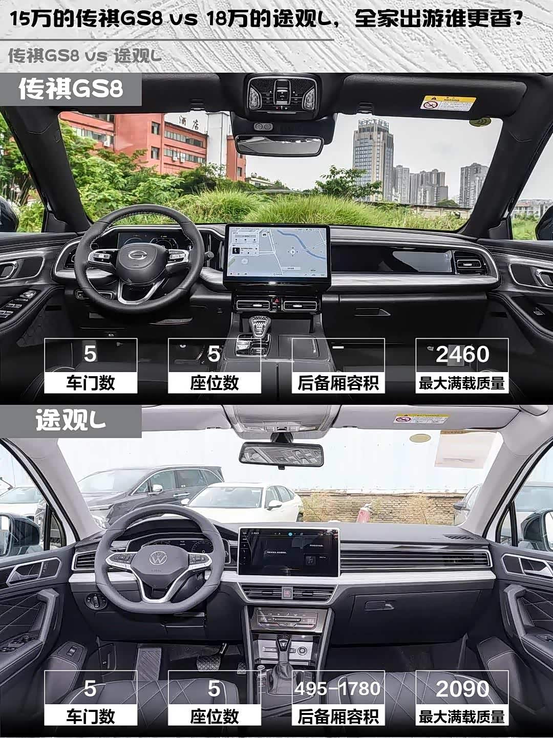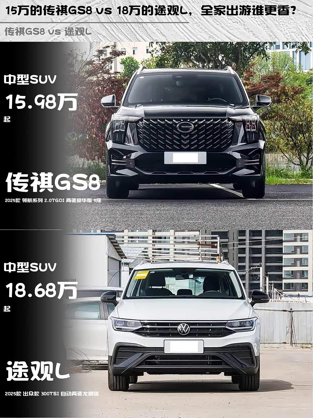 最近在选中型SUV的朋友看过来!今天给大家深度对比两款热门选手: 传祺GS8(参数|询价) 2025款 领航系列 2.0TGDI 两驱豪华版 5座 vs 途观L 2025款 出众款 300TSI 自动两驱龙腾版,看完这篇你就知道谁更适合你!🔥