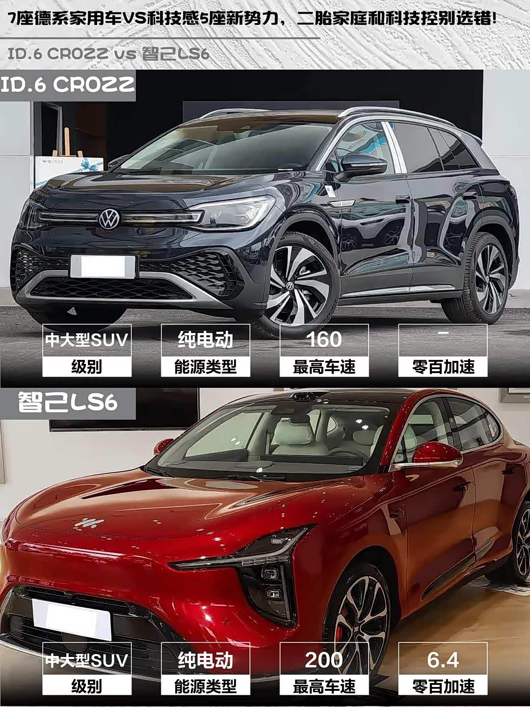 最近在选纯电中大型SUV的朋友看过来!今天深度对比两款热门车型—— ID.6 CROZZ(参数|询价) 2024款 PURE和智己LS6 2026款 纯电 Pro,帮你理清需求不踩坑🔥