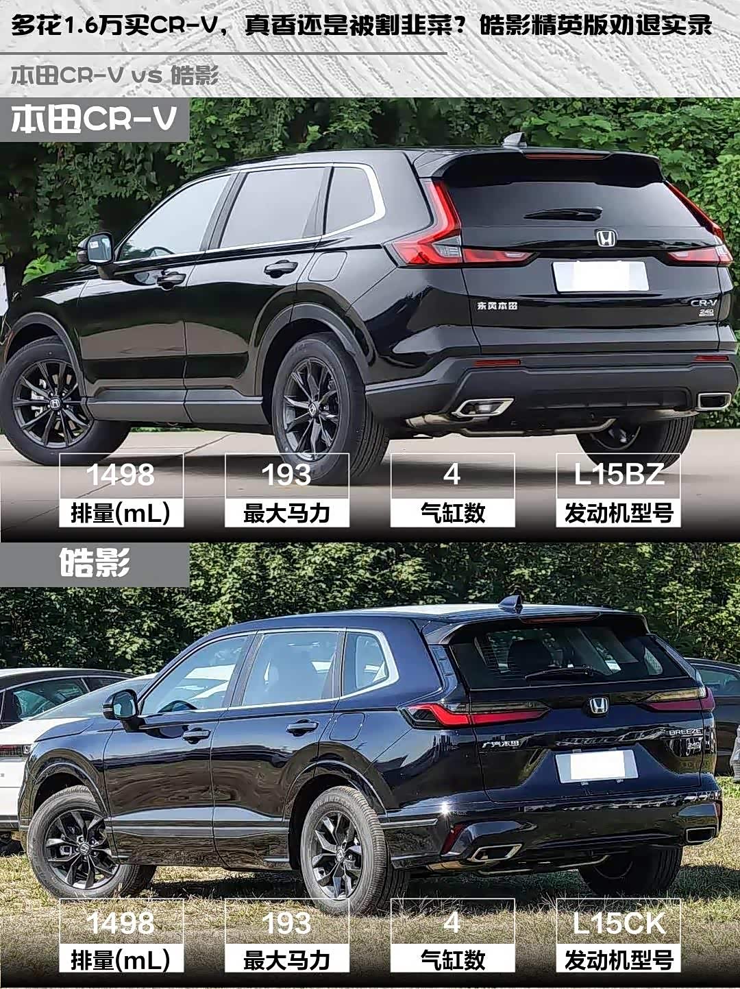 ⛽ 油耗实测:同样1.5T+CVT,CR-V WLTC 7.25L vs 皓影7.31L。市区通勤实际差距不大,但CR-V油箱大1.5L,续航焦虑更小