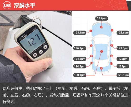 在漆膜水平测试环节,通过测试结果可以发现,整车漆膜平均厚度约为117.8μm,在测试过的同级别车型中处于中下游水平。从各关键部位的测试数据来看,虽然多数关键部位的漆膜厚度值比较接近,但发动机舱盖和车顶处的数值明显偏低,可见漆膜喷涂均匀性仍存在提升空间。