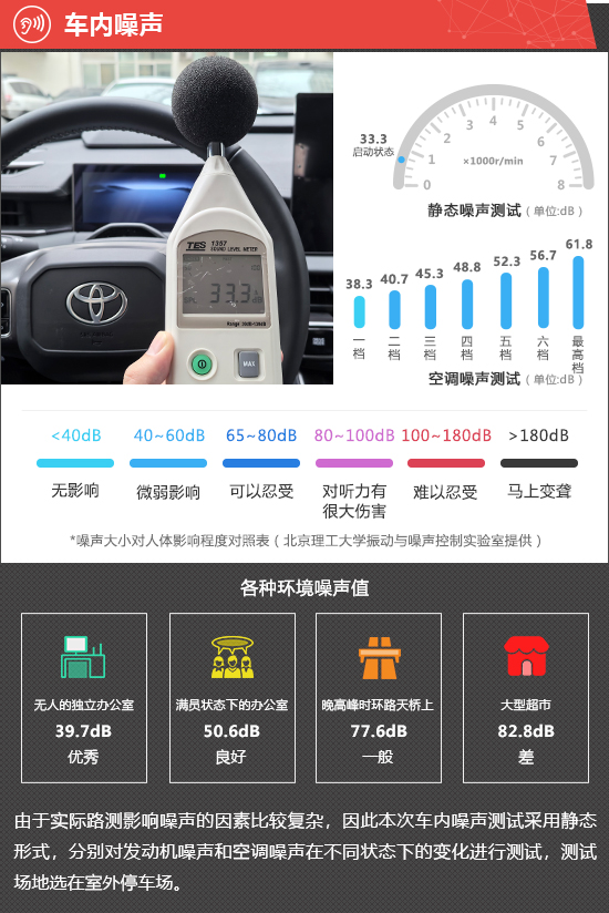 在静态噪声测试环节,2026款广汽丰田威兰达在启动状态下车内实测噪声值为33.3dB,在测试过的同级别车型中处于上游水平。由于评测车搭载油电混合动力系统,启动状态下发动机默认不工作,因此无法对2000rpm以及3000rpm的噪声进行测试。