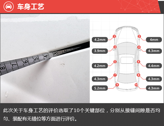 在车身工艺测试环节,整车共选取10个关键部位,每个关键部位都会选取3个关键点进行测量,以评价各关键部位缝隙的均匀程度。从测试结果来看,全车绝大多数部位的缝隙均值处于合理范围内,不过左后翼子板与后备厢连接处缝隙均值偏高,对最终测试成绩造成一定影响。