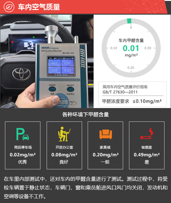 在车内空气质量测试环节,将车辆放置在车辆较少的内部地面停车场中,实测车内甲醛含量为0.01mg/m3,符合2012年3月1日起实施的,由原环保部和国家质量监督检验检疫总局联合发布的《乘用车内空气质量评价指南》(中华人民共和国国家标准GB/T 27630-2011)中的相关标准。