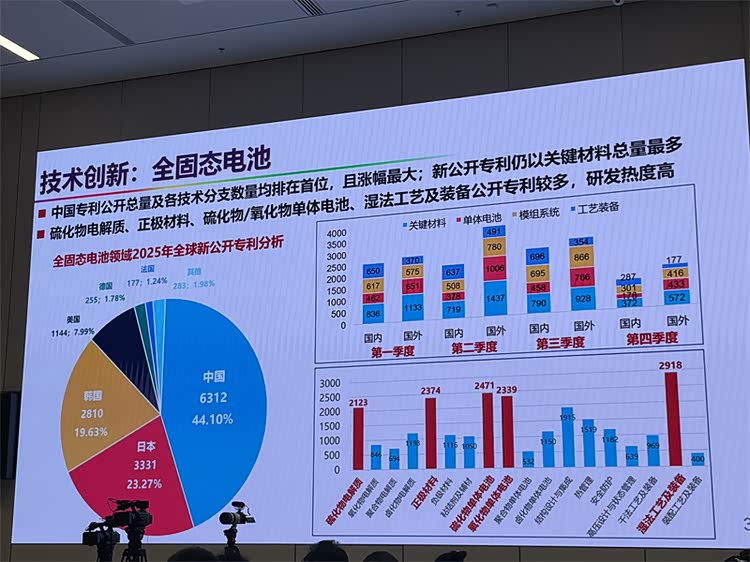 欧阳明高表示,中国真正做全固态电池是在2024年,此前国外已经做了十多年,中国是奋起直追。但得益于中国电池产业规模大、研发人员多等因素,到2025年,中国全固态电池新公开专利已经占全球44%,占比超过日本,位居全球首位。