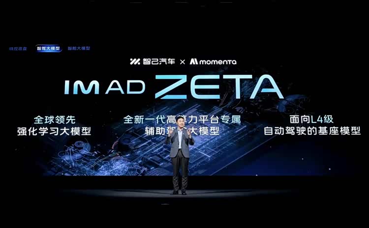 中层为辅助驾驶系统IM AD ZETA,由智己与Momenta联合开发,基于Thor高算力芯片平台,采用强化学习大模型,参数量较现有IM AD模型提升约3至4倍,性能上限据称最高可提升20倍。该模型通过云端世界模型进行强化学习,实现“先预判、再行动”的决策逻辑,官方定位为面向L4级自动驾驶的基座模型,现阶段以L4能力降维应用于L2级辅助驾驶。