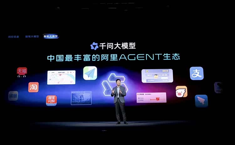 上层为智舱系统,搭载千问大模型,结合阿里AI Agent生态,打通高德、支付宝、飞猪、淘宝等服务端口。与智驾域和底盘域实现数据互通后,该系统支持“一句话直接控车”,典型场景为通过自然语言完成路径规划、POI筛选、服务预订等复合操作。