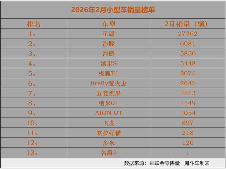 但在电动化与智能化时代,一部分纯电小型车登场之后,直接拉动小型车市场整体销量提升,不过,在2月份,这一细分市场的销量表现又很惨淡。小编从乘联会发布的零售销量数据中看到,2月份,只有一款小型车销量超过万辆。接下来,看看2月小型车销量榜具体车型排名与销量表现?