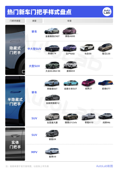 按照结构形式,这些热门新车的门把手可分为全隐藏式、半隐藏式和实体门把手三类,覆盖轿车、SUV、MPV等多个车型类别。