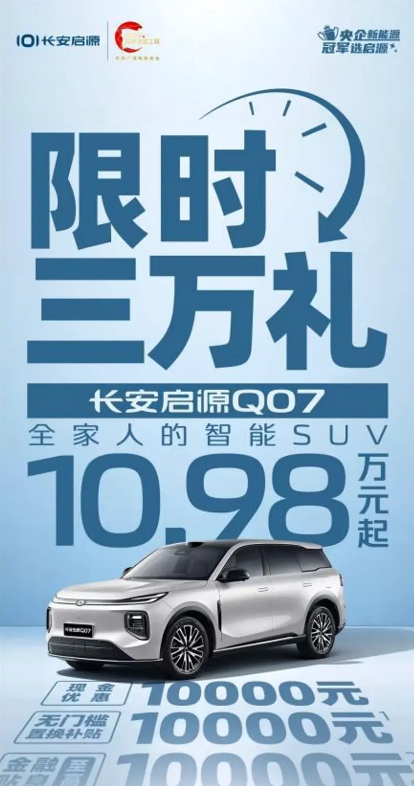 正值三月购车旺季,长安启源推出“限时三万礼”政策:现金优惠10000元、无门槛置换补贴10000元、至高金融贴息10000元,叠加后起售价下探至10.98万元。活动截至3月31日,正是入手好时机。