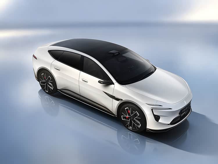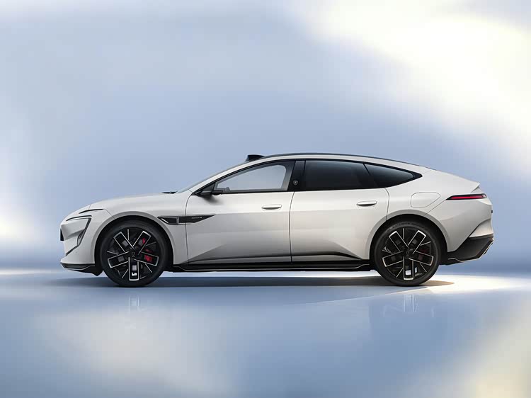 侧面造型方面,车身依然采用了溜背式造型,有着浓浓的轿跑风格,腰线采用了贯穿式设计,点缀出了车身侧面的层次感;门把手采用了半内凹式设计,降低了风阻,也兼顾了实用性;轮眉和侧裙部分设计有隆起的筋线,前翼子板位置依然有激光雷达,应该还是四颗激光雷达的方案;轮毂采用了双色五幅式造型,风格足够大气。