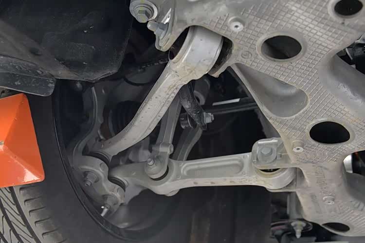这辆阿维塔06的底盘做工用料几乎挑不出毛病,接近满分。无论是前悬还是后悬,前副车架还是后副车架,都是粗壮的铝合金,并且前后车身还都采用了铝合金大压铸,在减重和行驶质感方面下足了功夫。不过,后实心刹车盘以及驱动轴球笼罩生锈这两点,着实有些遗憾。