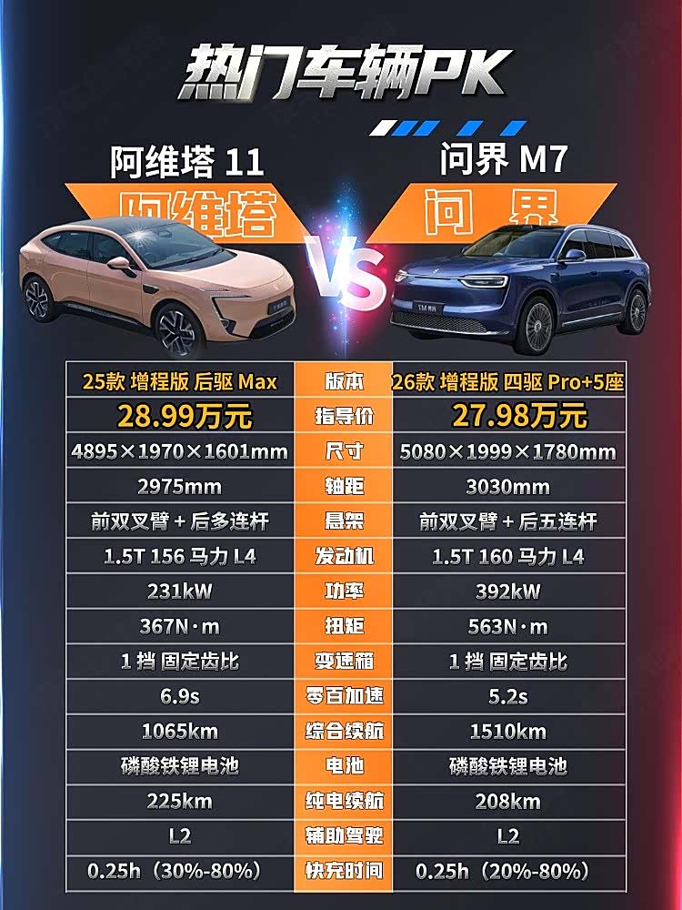 阿维塔11 2025款改款Max增程版售价为28.99万元,问界M7 2026款增程Pro+四驱版5座售价为27.98万元,两款车均为华为系车型,都以华为的智能化加持为主要卖点,那么哪一款车更值得入手呢?