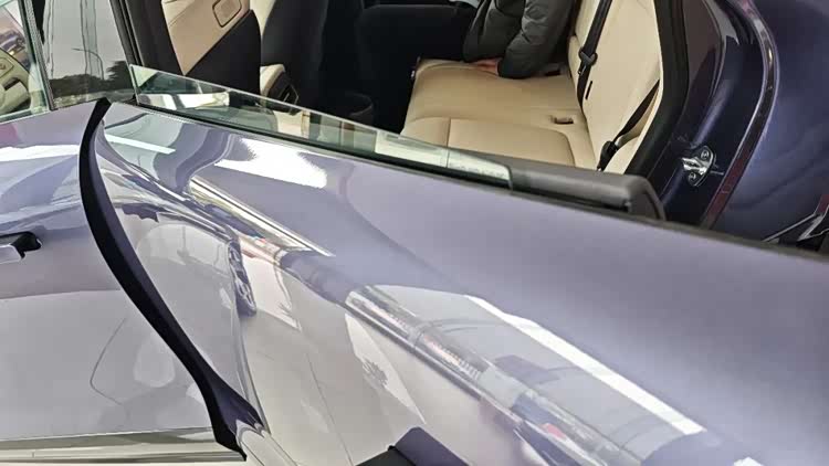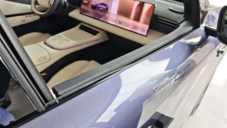 车窗上沿的镀铬装饰条不是高亮银色而是枪灰色,这就很让我喜欢,在保持质感的同时提升了颜值。顶配都没有后排隐私玻璃,有点遗憾。无框车门设计,前排双层夹胶玻璃,后排单层加厚玻璃,也是有点遗憾。好在隐藏式水切挺好看的,早期在极氪、领克车上常见的这项工艺现在也被越来越多同行借鉴了。前排的玻璃可以完全收到门板里,后排也只留一点点在外面,这已经比市面上绝大多数无框车门表现更好了。