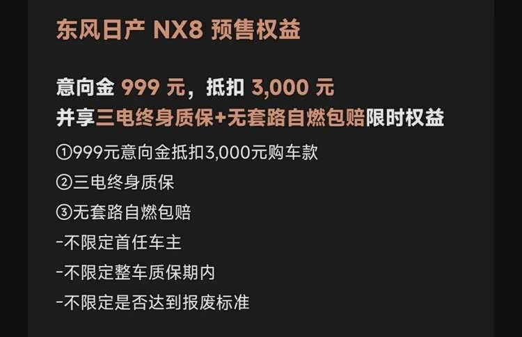 又到了最后喜闻乐见的猜价格环节,昨晚的预售发布会我本来以为至少会出来一个预售价,降低一点我猜价格的难度,没想到日产不按套路出牌,折腾了一个多小时连预售价也不发,预售发布会秒变盲订发布会。那我们就先看看目前的盲订权益吧。首先是999元意向金抵扣3000元车款,相当于直降2000元,这和N7当初一样,三电终身质保,无套路自燃包赔比其他车企的要看起来适用范围更广一点。