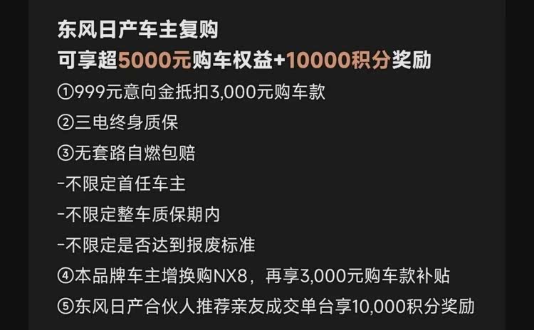 假如你是东风日产的老车主,在上述权益基础上还可以再多拿3000元购车补贴,推荐亲友成交的话一台能拿10000积分。这么看来是不是权益也就那么回事,没太多有吸引力的东西。