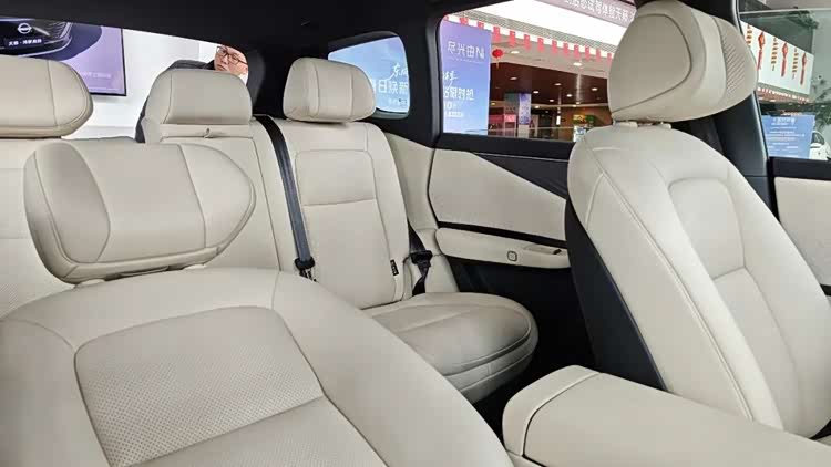 前排依然有AI自适应调节功能,传感器从N7那代的49颗升级到了53颗,按摩点位覆盖到了坐垫,顶配还有头枕音响,这车的头枕造型也很不一样,看起来特别厚。副驾驶位零重力座椅有一键启动和一键关闭功能,设计的位置不如铂智7顺手,躺下以后需要稍稍起身一点才能够到。但是躺平速度还挺快,腿托伸出去也不会顶脚。存在的问题也和铂智7一样,安全带设计在B柱上,甚至还是固定不可调节的,这样,零重力座椅就还是只能在停车的时候用了。