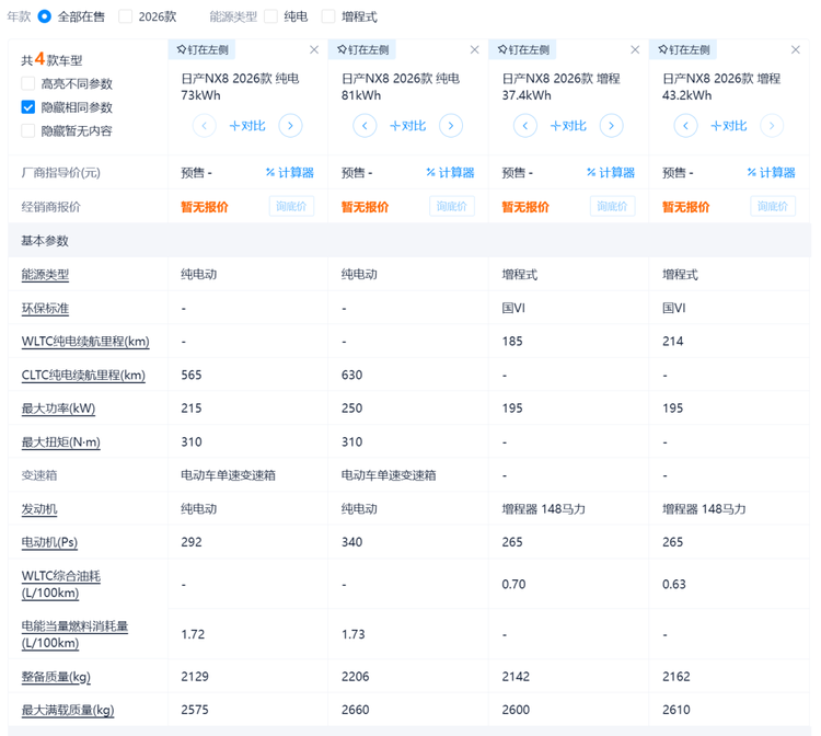 从三大垂类媒体上的数据库看(仅作参考,实际以官方发布为准),日产NX8有纯电和增程两套驱动形式,分为195kW、215kW和250kW三种动力水平,均为单电机。据销售透露,纯电车型为后置单电机,增程车型为前置单电机。电池共有四种规格,分别是增程车型的37.4kWh和43.2kWh电池和纯电车型的73kWh和81kWh电池,全系磷酸铁锂。关于电池供应商,由于三大垂媒提供的信息不一致,严谨起见我就暂时先不写了,唯一可以确定的是顶配车型采用的是宁德时代云盾电池,800V碳化硅平台,支持5C快充。
