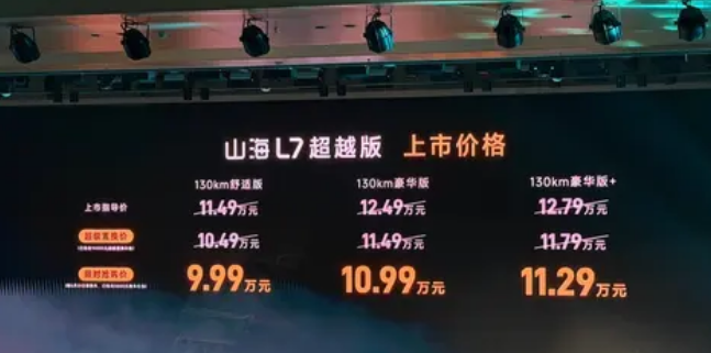 我们先来说说山海L7超越版,这款车定位是5+2座精品电混SUV,主要是面向想省油、要长续航还要空间大的普通家庭。因此这款车的空间可以说是一大亮点,车宽1900mm,轴距是2745mm,可以说是大七座布局,第二排腿部空间能到960mm,头部也有997mm,靠背还能在25°到41°之间调节,云朵舒享座椅支持支持5/7座灵活切换,还有12种座椅组合。后排还可以放倒,发布会上现场装下24个20寸行李箱,全家出行可以拉很多行李,这也是它主打旅行小房车的底气。
