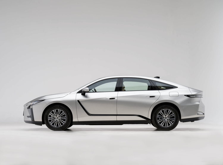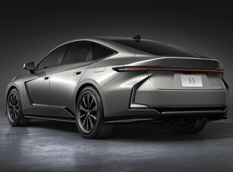 来到车身侧面,全新的雷克萨斯ES采用了轿跑式的车身设计,弧线形的车顶搭配着大量优雅流畅的线条勾勒,四个隐藏式门把手搭配着无边框车门,比较吸引眼球的是其在翼子板和侧裙处通过双色设计呈现出类似导流板的效果,配合上方凌厉的腰线展现出运动姿态。车窗四周加入了黑色的装饰条,混动版车型搭载18英寸轮圈,纯电动版车型则会采用21英寸轮圈,还有银色的刹车盘和大尺寸刹车卡钳。整车做出了前低后高式的姿态,给人一种蓄势待发的感觉。尺寸方面,其长宽高分别为5140/1920/1555(混动版)mm,轴距为2950mm,这一回雷克萨斯ES的车身尺寸不会被消费者诟病了。