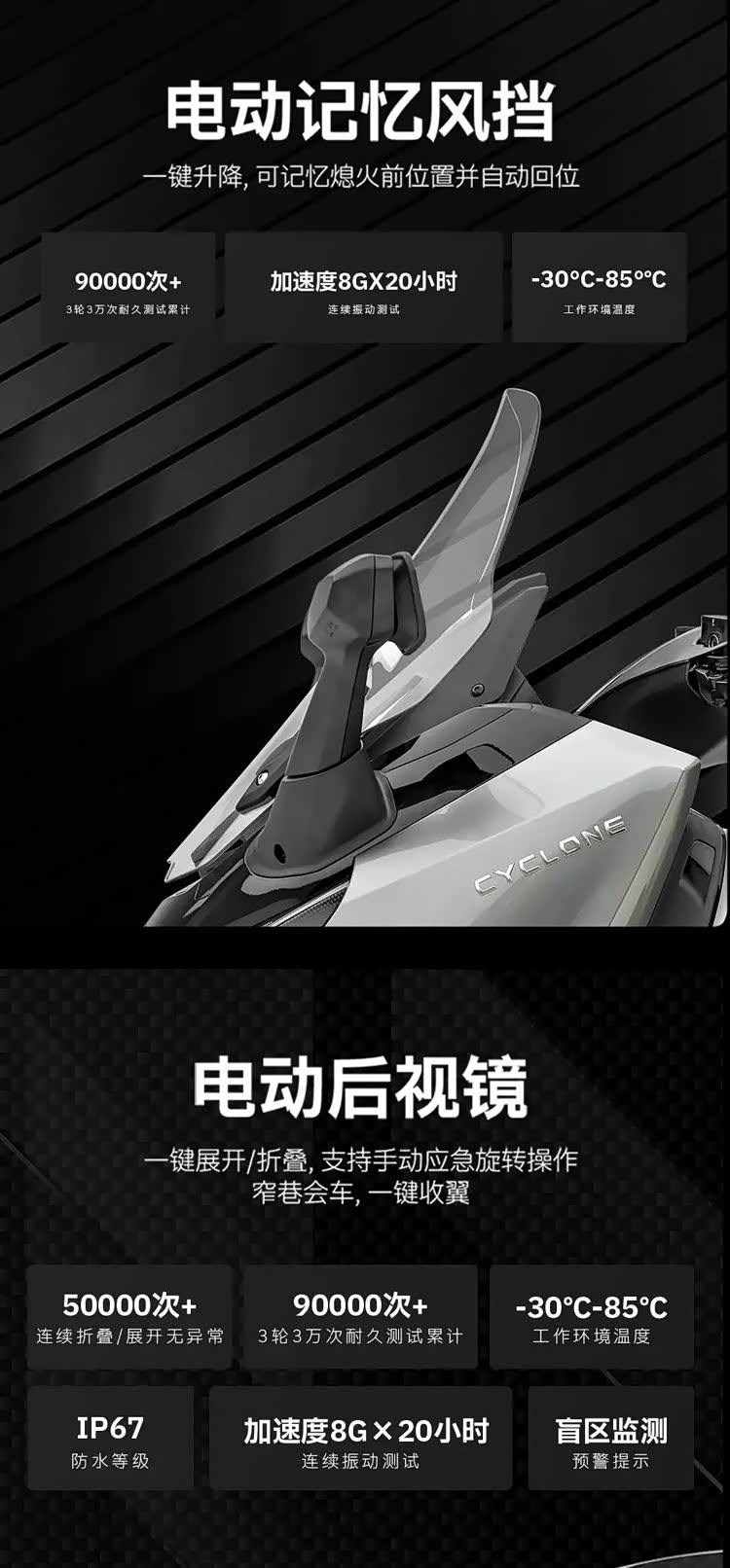 舒适与便捷配置:智境版专属电动记忆风挡(可记忆熄火前位置)、电动折叠后视镜、自动电动大撑,一键操作即可完成复杂调整,长途骑行更轻松。手把加热 + 座垫加热为冬季骑行刚需,北方用户体验显著提升。6.5 英寸 TFT 全彩仪表支持手机导航投屏、胎压实时显示,搭配 T-BOX 车联网与 3 年免费流量,骑行数据一目了然。