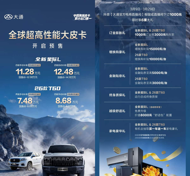 最近从官方渠道了解到,上汽大通MAXUS旗下的两款皮卡有了新动静。全新的 星际(参数|询价)L,以及2026款的T60车型,预计会在3月底到4月初正式推向市场。目前这两款车已经开始了预售,价格也大致有了范围。星际L提供了两种配置选择,预售价格在12.98万和14.18万,如果是在限时权益期内下订,价格则是11.28万和12.48万。另一边的2026款T60,预售价为8.68万和9.88万,享受权益后的价格是7.48万和8.68万。对于正在考虑这个价位段皮卡的消费者来说,这算是一个值得关注的时间节点。