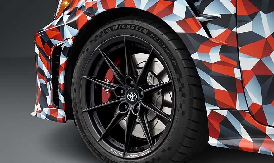 先看外观,新车延续了GR家族的战斗风格,头灯造型像两个立着的“7”,辨识度拉满。进气口面积加大,散热效率更猛,侧面紧凑的车身配上多辐式轮辋+红色刹车卡钳,运动感直接爆表。外后视镜、车窗边缘的黑化处理,加上疑似米其林CUP 2高性能轮胎(245/40 ZR18),妥妥的“赛道预备选手”配置。车尾最吸睛的是尺寸更大的后扰流板,高速稳定性更强,尾灯和头灯造型呼应,下方三出排气布局和现款保持一致,战斗气息十足。
