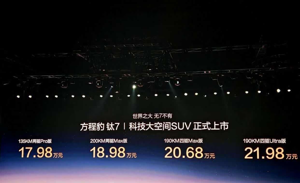 2025年9月9日,比亚迪旗下方程豹品牌正式推出钛7,定位“科技大空间SUV”,推出四款车型,价格区间为17.98万元至21.98万元。