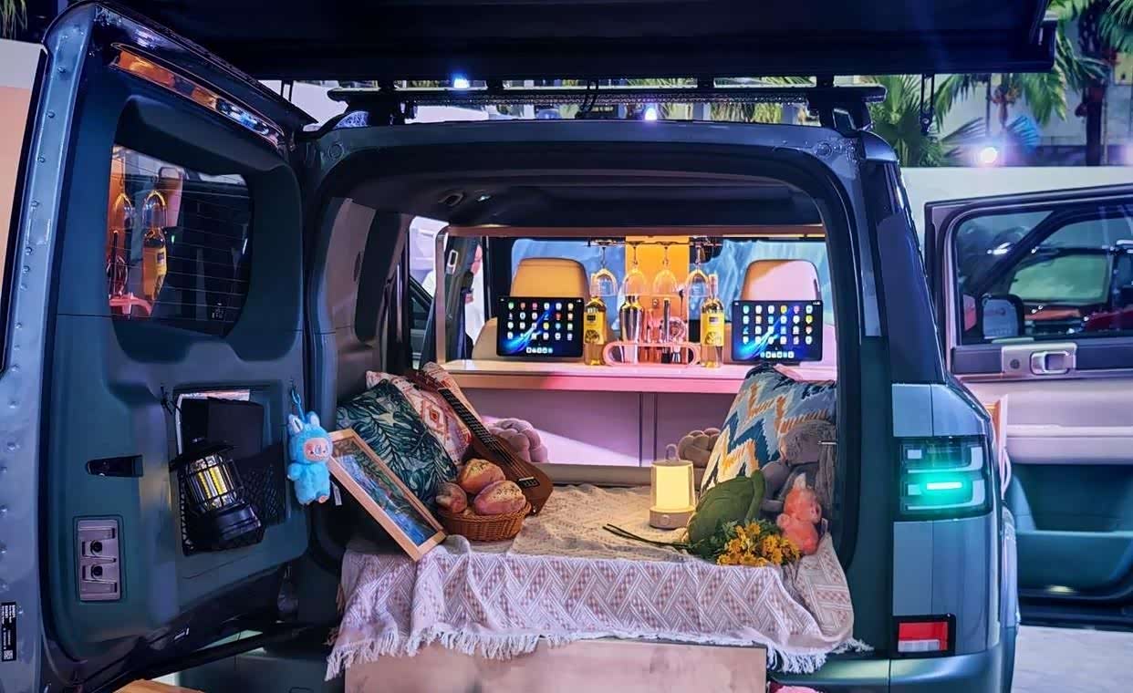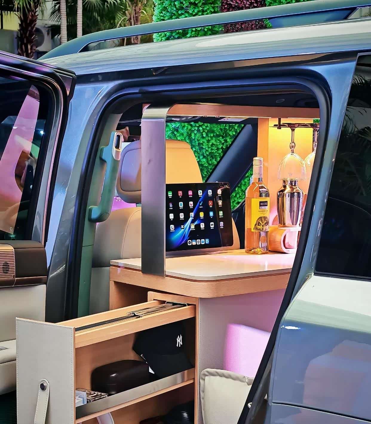 后排座椅支持一键放倒,可迅速形成近似“大床房”的平坦空间,后备箱容积扩展至1880L。 车内设计了47处储物空间,包含后排隐藏式冰箱,满足家庭出行的各种收纳需求。