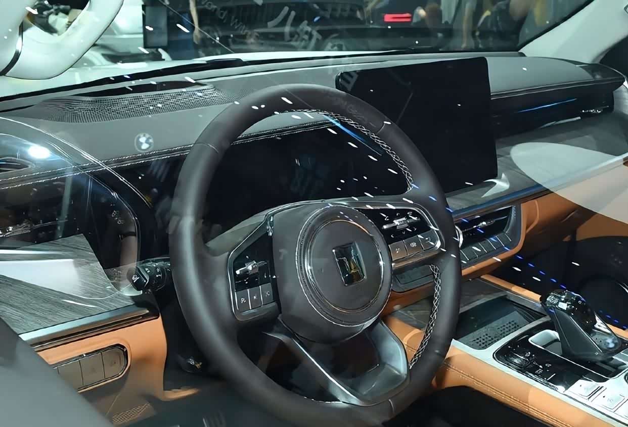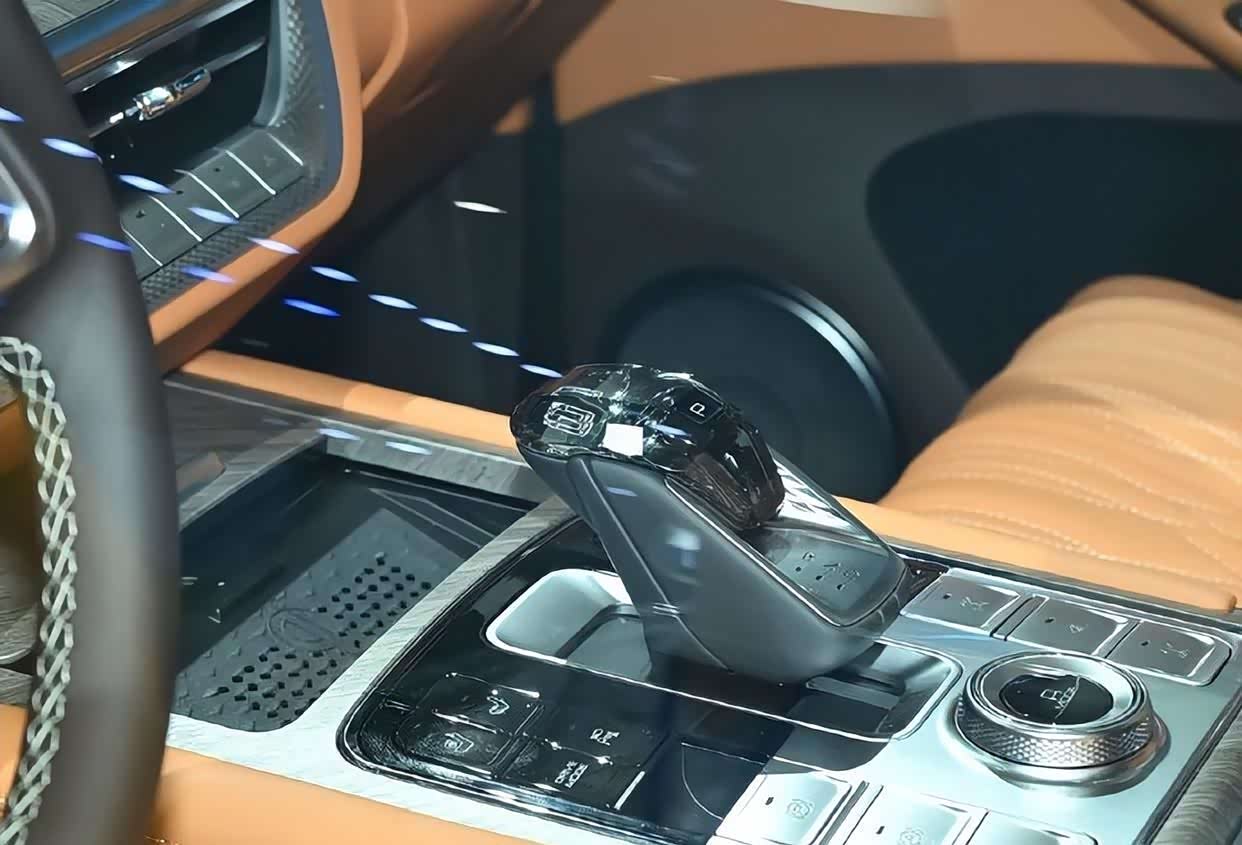 内部的豪华感营造与粗犷的外观形成了明显反差。大量的棕色内饰,双悬浮大屏,水晶材质的换挡机构,豪华感出众的石英钟,都显得奢华无比。此外,还匹配了12.3英寸的液晶仪表,14.6英寸的超大悬浮式中控。值得一提的是,内后视镜上还拥有流媒体的后视镜,能够防止反光,以及记录作用。作为一辆新能源汽车,车机系统表现自然是不错的,采用的是咖啡OS 3.0的智能网联系统。