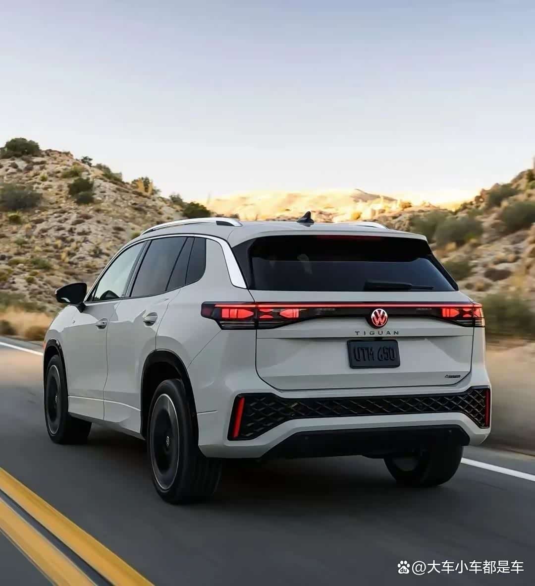 先看外观,2025款途观L采用大众最新家族设计语言,多边形前格栅与IQ.Light全LED矩阵式大灯巧妙融合,中间灯带相连形成贯穿式造型,不仅拉伸视觉宽度,还极具科技感。下方封闭式宽厚饰板镶嵌其中,搭配R-Line版本专属运动套件,C字形黑色饰板与镀铬元素相得益彰,再加上棱角分明的前铲,运动气息扑面而来。车身侧面,线条流畅,银色行李架与车窗镀铬饰条提升精致感,大尺寸双拼色花瓣轮毂,呼应年轻定位。车尾部分,扰流板、熏黑贯穿式尾灯、下方车标字母以及带运动套件和镀铬饰条的保险杠,整体造型动感又不失稳重 ,满足不同年龄段消费者的审美。
