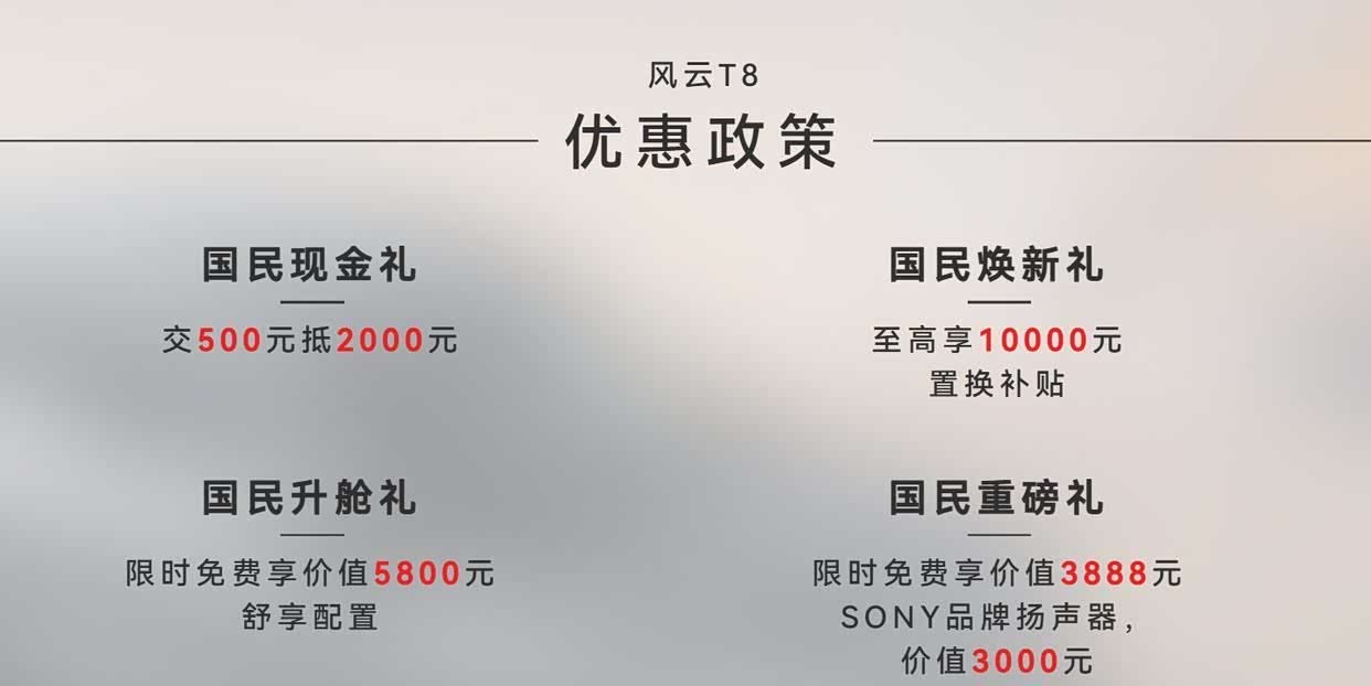 这款新车就是来自奇瑞的 风云T8(参数|询价),这是一款中型插电式的混动SUV,这款新车目前已经展开了预售,预售价为10.99-15.69万元,目前该新车还享受交500抵2000的优惠,还有一些配置赠送比如索尼音响,所以价格方面确实不是很贵。