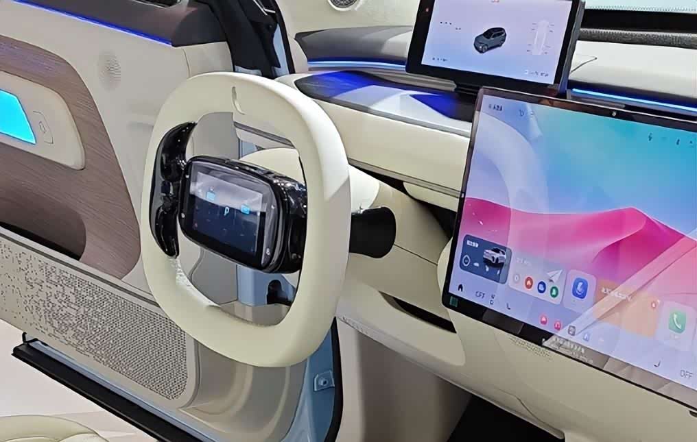 内部设计比较有意思,采用的大四座设计,而中控部分则是我们熟悉的双悬浮屏幕构造,并且行车屏幕可以进行左右滑动,方向盘上也安装了更加实用的车载屏幕!你说类似的设计会不会迅速铺开来呢?