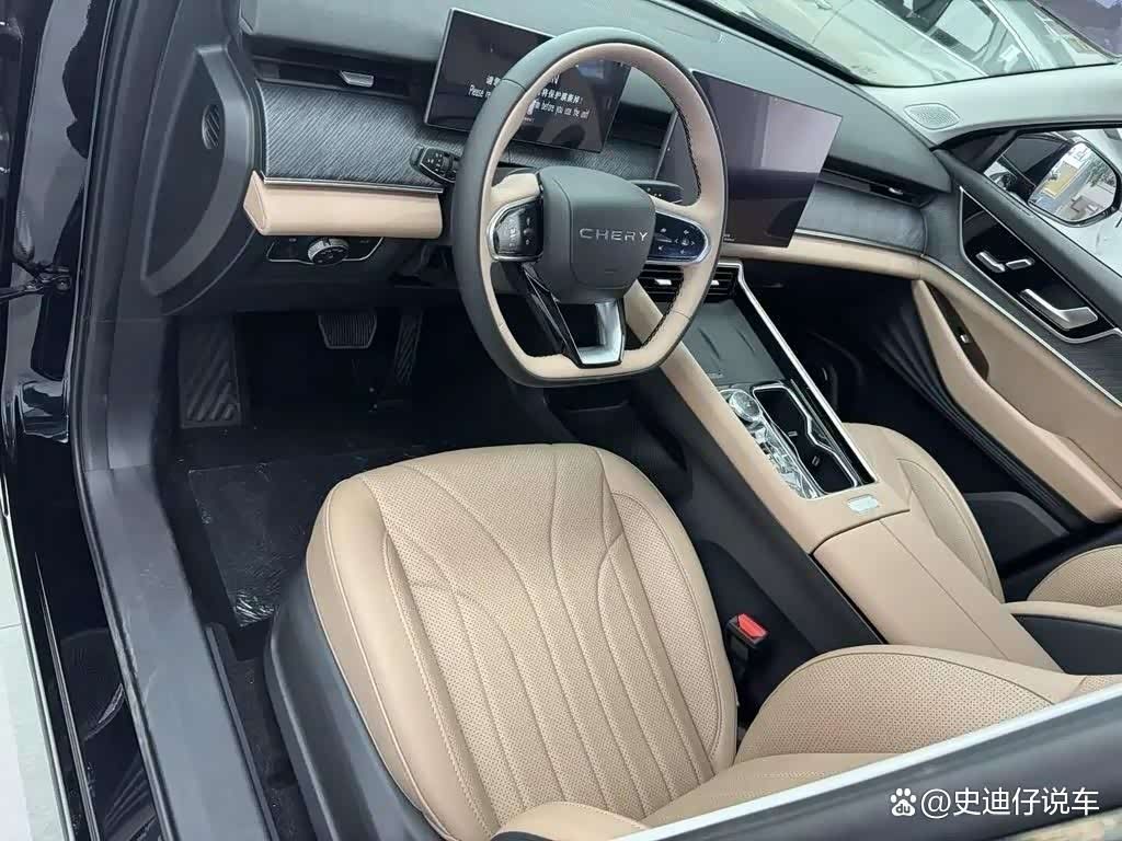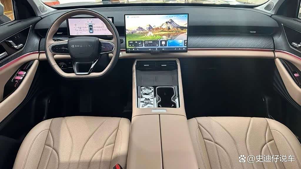 在内部装饰上,瑞虎8L长虹版继续采用了当前的设计风格,中控台上的15.6英寸2.5K悬浮式大屏与10.25英寸的矩形全液晶仪表盘相结合,展现了浓厚的科技氛围,并且配备了高通骁龙8155的高级智能座舱。车辆的内部装饰以琥珀棕的设计风格为主,并配有大量的皮质装饰、木纹饰板和氛围灯,展现出一种奢华的感觉。通过加入三幅式平底方向盘、电子怀挡、50W的手机无线充电功能以及门板和座椅的调节按钮,车辆的整体档次感得到了进一步的提升。