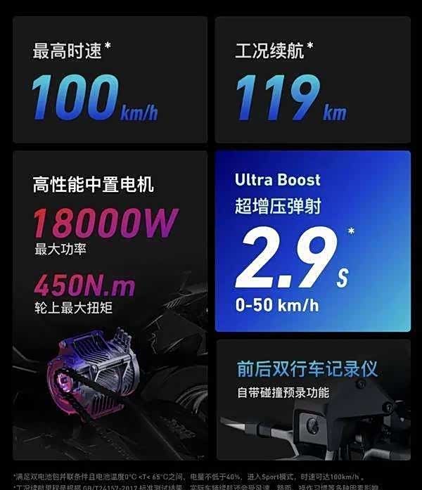 动力性能尤为抢眼,搭载最大功率18kW、最大扭矩450牛米的电动机,换算约24.5匹马力,与传统燃油摩托豪爵铃木GSX250R相当,实属电动车中的“性能怪兽”。最高时速可达100公里,续航里程官方数据约为119公里,满足日常与周末玩乐需求。