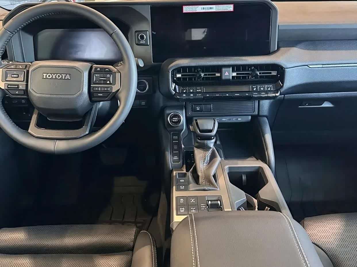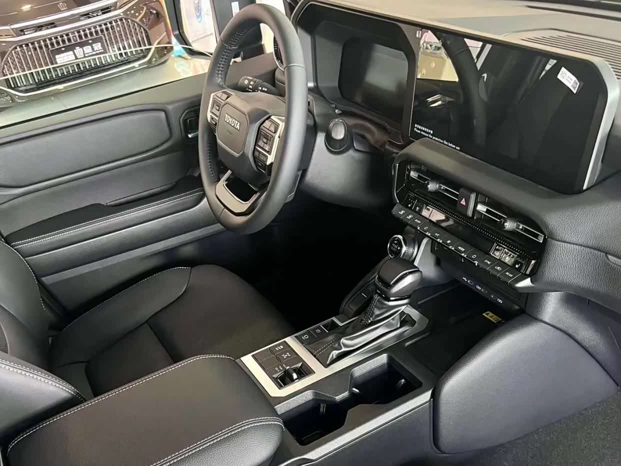 内饰方面还是非常豪华的,左侧是皮革材质包裹的三幅式多功能方向盘,前方液晶仪表盘和悬浮式中控显示屏,空调出风口下方还保留了部分物理按键,而且横平竖直的设计线条和A柱处的扶手都展现了其硬派越野车的身份。