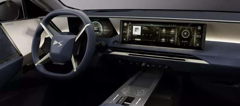 不仅是外观具有艺术感,内饰的表现同样如此!新打造的四幅式方向盘,能给人全新的感觉,四角的设计镶嵌有金色的元素,方向盘中央的DS算是身份的展现。显示区造型独特,除了配备了液晶仪表以外,中间还搭配有大尺寸悬浮式中控屏。单就图中看,应该不在一个平面上!官方介绍,这组仪表的灵感源自船舶!此外我们在车内没有看到任何物理按键,仅在中控屏的下方看到了一组横向的空调出风口!传统挡杆位置也做了升级,采用了一整块触控区,换挡机构应该集中在了控制区内!