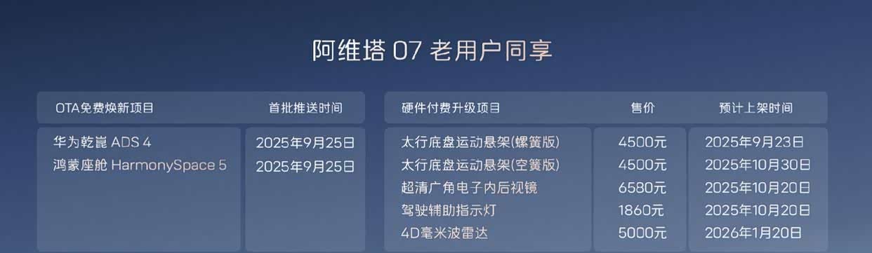 阿维塔07 2026款为年型改款车型,它保持了原款车型的尺寸与轴距不变,并新增晴蓝外观配色和岩棕内饰配色。在配置上,它全系标配四门电吸门和流媒体电子内后视镜,支持选装超清电子外后视镜和HALO交互屏;它搭载了35.4英寸4K全景远端屏,支持选装智能车载冰箱,配备了前排双零重力座椅和英国之宝音响系统;其座舱采用华为鸿蒙Harmony Space 5系统,提升人机交互体验。