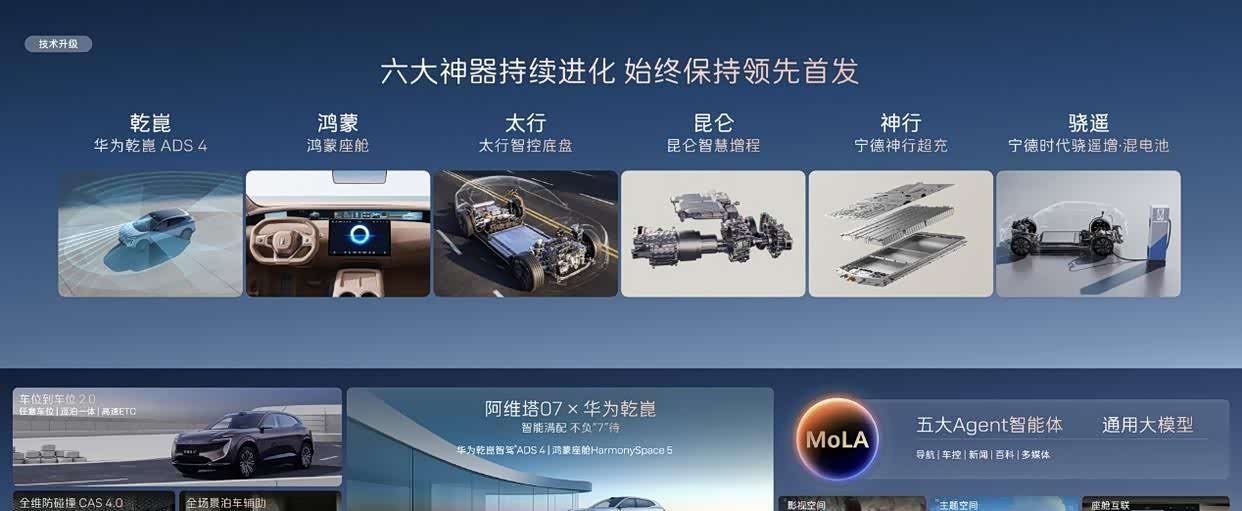 安全性能方面,新车车身结构采用“六横九纵”高刚性设计,配备四门双防撞杆和9个安全气囊,获得了C-NCAP五星安全认证;主动安全上则搭载了华为CAS 4.0全向防碰撞系统。其电池采用NP无热扩散技术,符合超越新国标的安全标准。