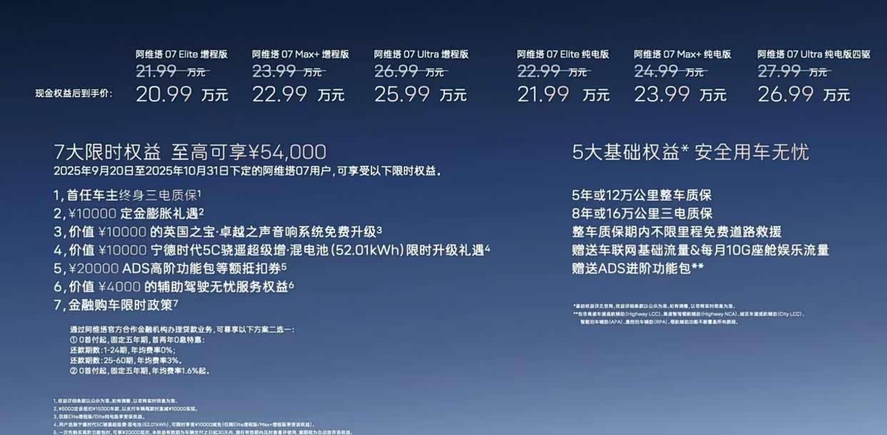 官方还特别推出了10月31日前下定的用户可享受七大限时购车权益,包括首任车主终身三电质保、10000元定金膨胀、英国之宝音响免费升级、宁德时代5C电池升级、20000元ADS高阶功能包抵扣券、4000元辅助驾驶服务权益以及金融购车政策。