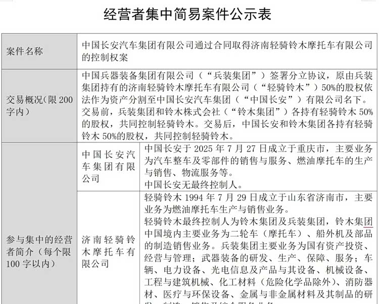 日前,《每日经济新闻》记者从国家市场监督管理总局官网获悉,反垄断执法二司已正式对“中国长安汽车集团有限公司通过合同取得济南轻骑铃木摩托车有限公司的控制权案”进行为期10天的公示。