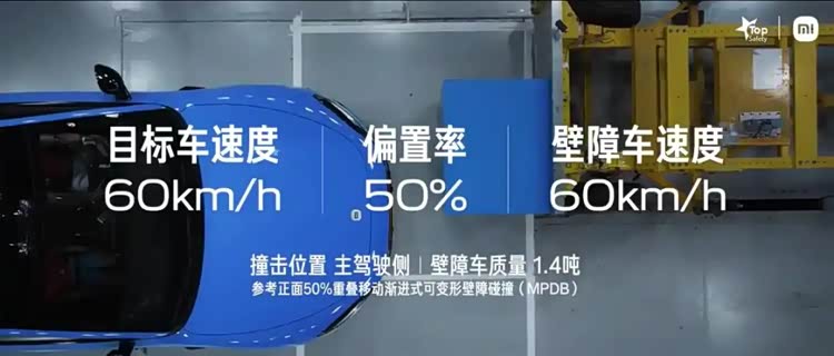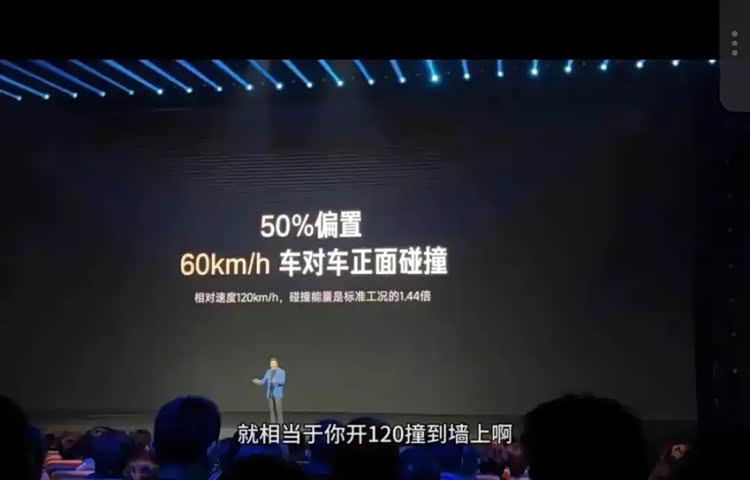 但是在介绍产品的时候,雷军表达了一个观点,却在发布会之后引起了广泛讨论,在发布会上,雷军提到,50%偏置碰撞,60km/h车对车正面碰撞,相对速度120km/h,相当于120km/h时速撞墙,碰撞能量是标准工况的1.44倍!其中“相当于120km/h时速撞墙”就引起了很多小伙伴的质疑,因为从物理学的角度来说,这种表述显然是不准确,因为相对速度120km/h没错,但是这并并不意味着两款车受到的撞击能量就和120km/h撞墙是一样的。
