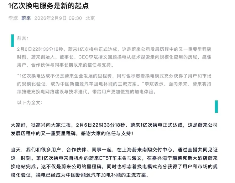 在此之前,李斌曾公开提及蔚来1亿次换电达成的重要时刻,没有刻意渲染高光,只客观讲述了这一里程碑背后的付出。2月6日22时33分18秒,蔚来正式达成1亿次换电,这不仅是公司发展历程中的重要节点,也印证了换电模式的实用性和用户认可度。从第1次到第1亿次,蔚来用了2819天,这条发展之路并不平坦。过去11年里,蔚来在充换电基础设施领域持续投入,累计投入超过180亿元,布局的相关专利超过2100项,这些投入没有停留在口头,而是实实在在转化为了覆盖广泛的换电网络和稳定的换电体验。如今,换电已经成为蔚来用户日常补能的重要选择,也逐渐成为新能源汽车补能的主流方案之一。