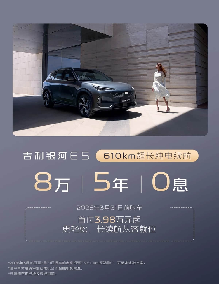 综合来看,吉利银河E5 610km版型是一款主打务实家用的纯电SUV,没有花哨的配置堆砌,也没有过度宣传的噱头,无论是空间、动力还是续航,都围绕着家庭用户的核心需求展开。这次推出的5年0息金融政策,进一步降低了购车门槛,让更多预算有限的消费者能够入手中高配长续航版本。对于追求实用、看重性价比,且主要用于日常通勤和家庭出游的消费者来说,这台车确实值得关注。尤其是在3月31日前购车,能享受低首付和长周期0息的双重福利,性价比进一步提升。